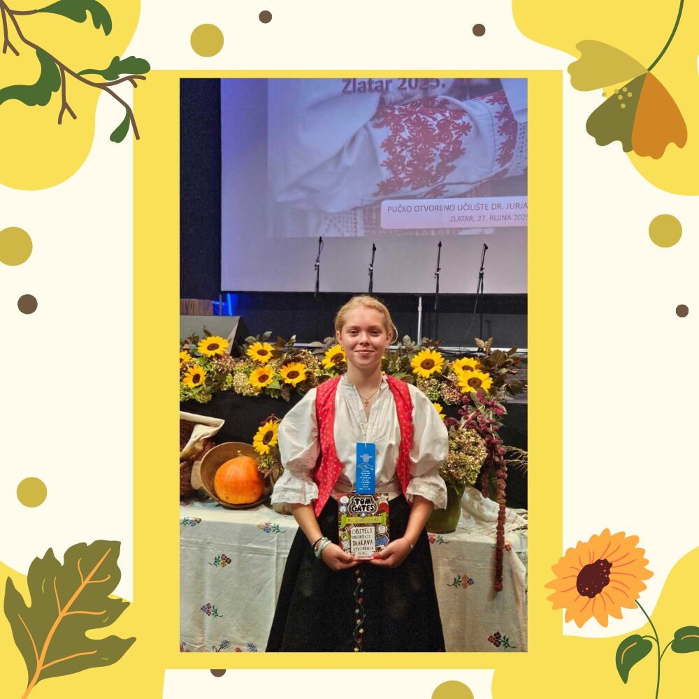 Na spomenutom Zboru sudjelovala je i učenica naše škole, Erika Šverko, koja sada polazi 8.b razred, sa svojom pjesmom Čuvar detinjstva. Upravo je po Erikinoj pjesmi nazvana i jedna cjelina u Zborniku objavljenih pjesama. Erika je recitirala svoju pjesmu na završnoj priredbi koja se održala 27. rujna u Zlataru, u obnovljenoj zlatarskoj Sokolani. Svojom izvedbom oduševila je i žiri i publiku te osvojila 1. nagradu. Nagradu joj je uručila i predsjednica Povjerenstva, poznata književnica Željka Horvat-Vukelja. Pjesma je uvrštena u Zbirku dječje kajkavske poezije. Erikina mentorica je Nikolina Fuš Zvošec, prof., a na nastup ju je pratila i profesorica Tihana Rajher koja se pobrinula za nošnju u kojoj je Erika nastupila te za podršku učenici kao i mentorici.