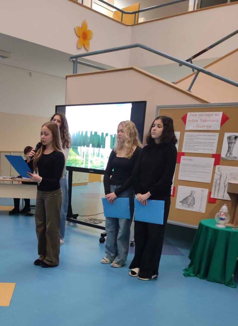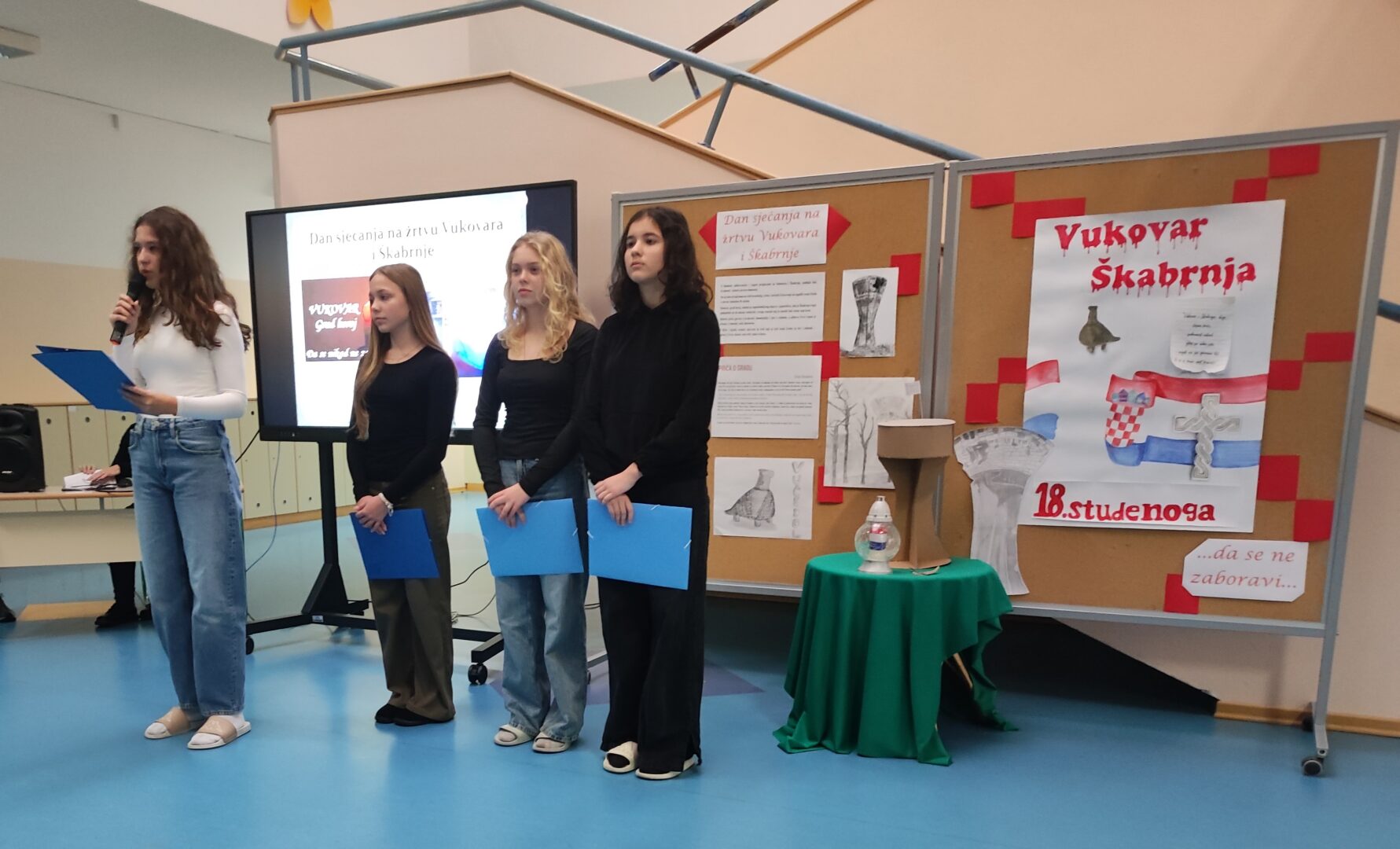 Program je započeo gledanjem kratkog, ali iznimno dirljivog filma „Zapali svijeću, prijatelju“ koji je svakog prisutnog duboko potaknuo na razmišljanje o žrtvi i ljubavi prema domovini. Nakon filma učenice Erika Šverko, Greta Siladi i Ela Fundak pročitale su ulomke iz djela poznatog vukovarskog novinara Siniše Glavaševića čije su riječi, i danas, snažan podsjetnik na ljudskost i nadu u najtežim trenucima. Učenica Eva Lukša svojim je toplim glasom pročitala pjesmu Lovre Erdeljija koja je unijela dodatnu emociju i tišinu među okupljene. Posebno se istaknuo i govor ravnateljice Romine Volar koja je naglasila važnost čuvanja uspomene na sve žrtve Domovinskog rata te istaknula zahvalnost onima koji su dali najviše – vlastiti život – kako bismo danas živjeli u slobodi. Program je završen zajedničkom minutom šutnje nakon čega je zapaljena svijeća kao simbol svjetla, nade i trajnog sjećanja na Vukovar i Škabrnju.
