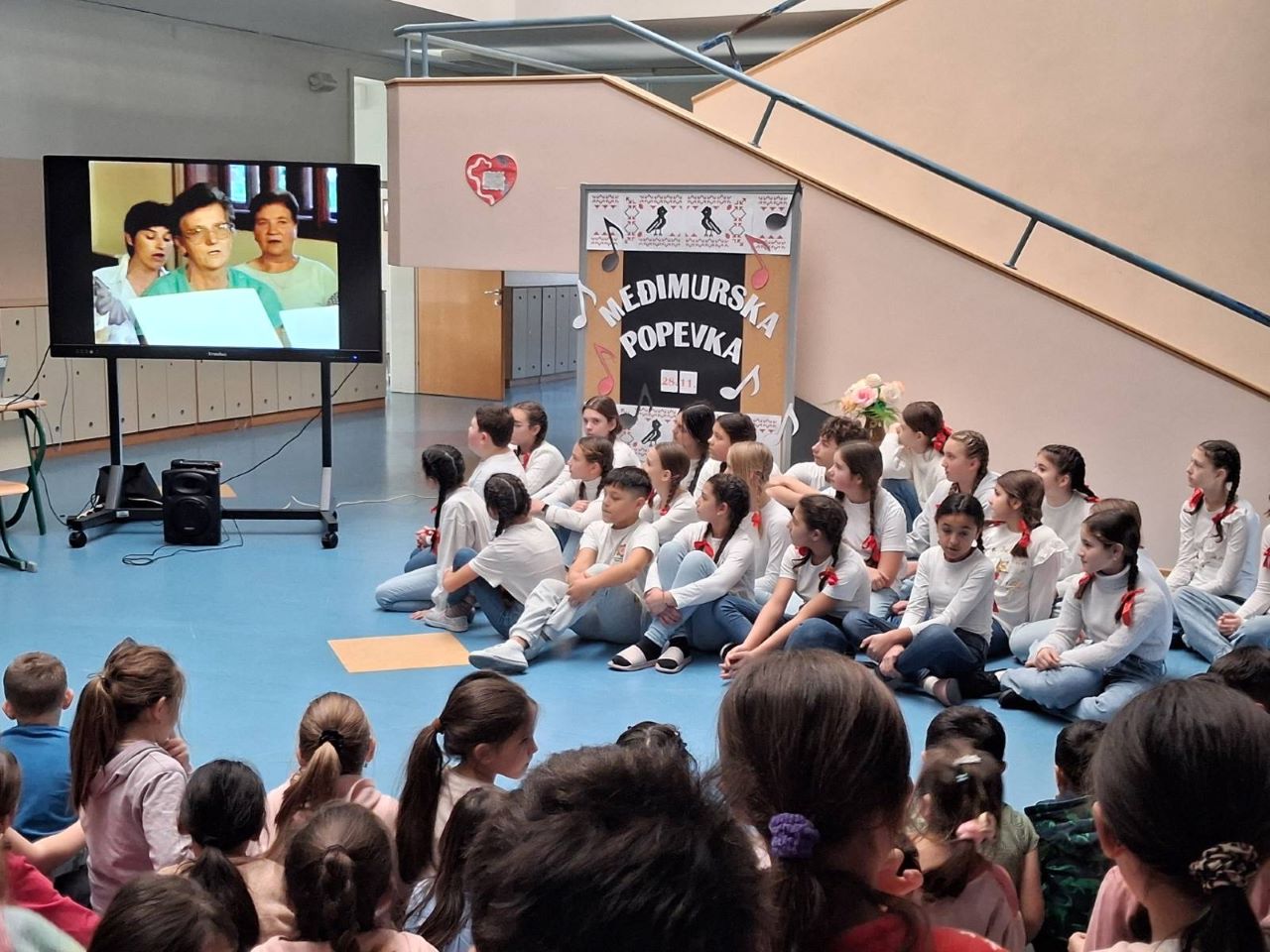 Današnje zajedničko okupljanje u holu  naše škole proteklo je u radosnom i  svečanom ozračju podsjećajući sve prisutne na ljepotu i vrijednost Međimurske popevke.