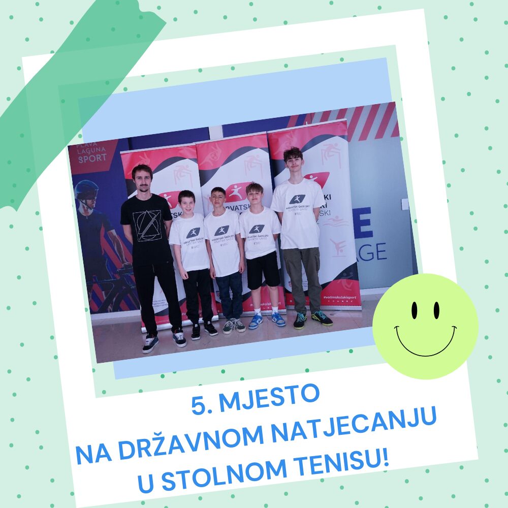 Dana 8. – 10. travnja 2026. godine održano je Državno natjecanje u stolnom tenisu na kojem je sudjelovala i ekipa naše škole, ostvarivši vrlo dobar rezultat osvojivši 5. mjesto u ukupnom poretku.